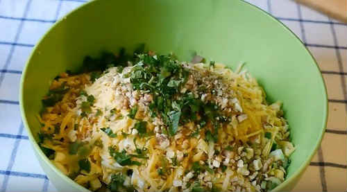 - Змішайте, заправте майонезом. Посипте сиром, перетвореною в крихту. Перед подачею прикрасьте, розкидавши сухарики і зелень.