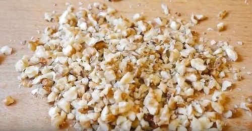 Роздрібніть ядра волоських горіхів. Не намагайтеся розчавити зовсім в крихту, залиште трохи великих шматочків.