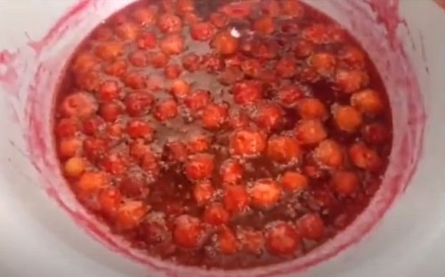 - Складіть сировину в каструлю, залийте зазначеною кількістю води. Поставте на сильний вогонь. Коли ягідки почнуть набрякати, виловите їх з каструлі.