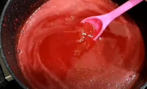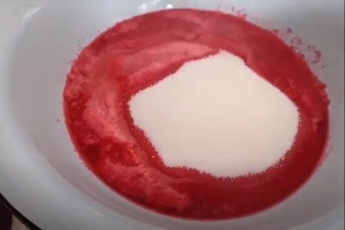 - Коли сік закипить, всипте цукровий пісок. Розмішуйте, поки солодкість не розпуститься. Проварити на середньому вогні, відрахувавши після закипання джему 3-4 хвилини.