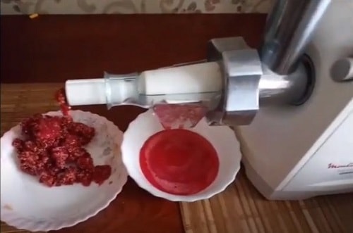 - Подрібніть ягоди в м’ясорубці або попрацюйте блендером. Отримане пюре протріть через сито, видаливши макуха і кісточки. Останню маніпуляцію допустимо пропустити, але будьте готові взимку поплюватися.