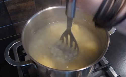 Коли бульби зваряться, витягніть цибуля, він нам більше не знадобиться, приберіть лавровий листочок, селера. Картопля, прямо в каструлі, роздушіть.