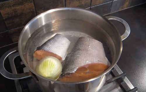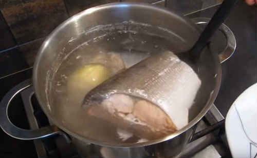 - Зваріть бульйон, поклавши цибулину, лавровий лист і кілька горошин перцю. Голову закладайте відразу, проваріть приблизно 40 хвилин. Потім додайте в каструлю філе риби, воно вариться швидше. Готуйте ще 10 хвилин.