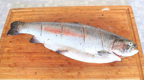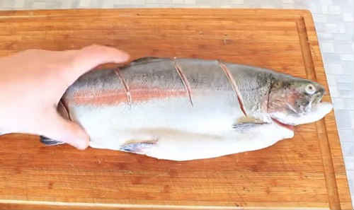 Гострим ножем зробіть кілька глибоких надрізів по всій довжині рибини (з двох сторін).