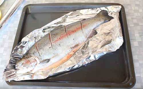 Вистеліть деко алюмінієвою фольгою, розкладіть рибину. Зробіть невеликі бортики навколо тушки, щоб не витікав сік.