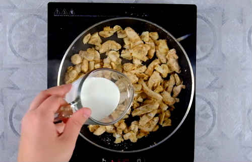В окремій посудині розколотіть вилочкою жовток у решти 50 мл. вершків. Влийте в м’ясо.