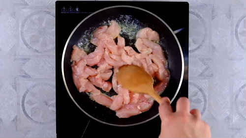 Наріжте куряче м’ясо довгою соломкою, відправте в масло. Обсмажуйте, поки шматочки філе не побіліють.