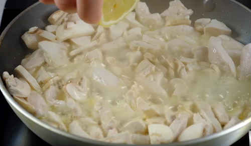 Гарненько перемішайте, продовжуйте готувати разом на великому вогні. Влийте сік від половинки лимона.