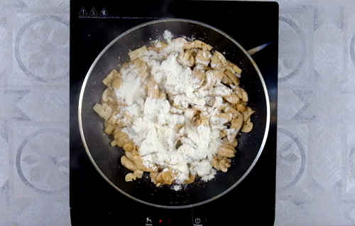 Дочекавшись, коли м’ясо красиво зарум’яниться, додайте борошно.
