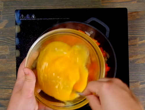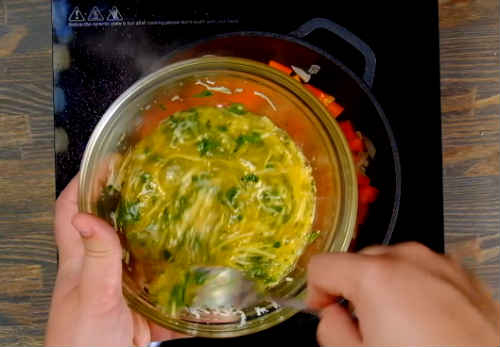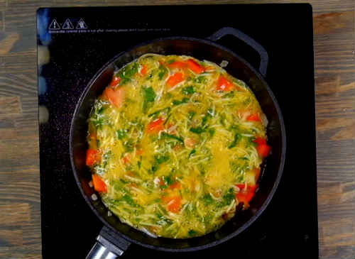 Вилийте яєчну суміш на сковорідку до овочів. Перемішайте вміст. Здобріть перчиком, посоліть. Готуйте на малому вогні, поки краю страви не почнуть «схоплюватися», а серединка залишиться ще рідкою.