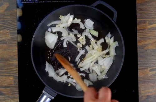 Нашаткуйте половинку цибулини півкільцями, відправте слідом. Продовжуючи помішувати вміст, смажте кілька хвилин.