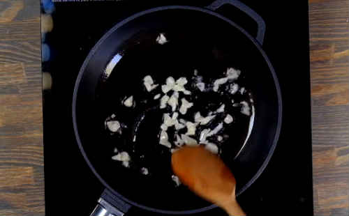 Покришіть часникову часточку, закиньте в розігріте масло на сковорідку. Обсмажте буквально хвилинку-другу, активно помішуючи.