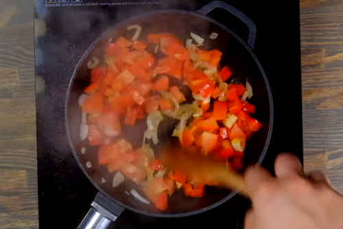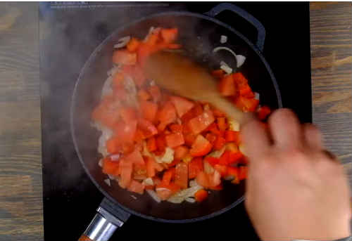 Коли цибуля злегка підрум’яниться, викладіть порізаний кубиками перець.