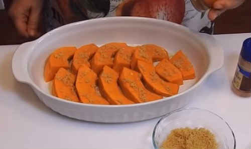 Гарбуз – чудовий гарнір, запікаючи її без цукру, ви отримаєте на виході низькокалорійне блюдо, з мінімумом калорій. Смачний гарнір в гарячому, і в холодному вигляді, подається до м’яса, риби, курки.
