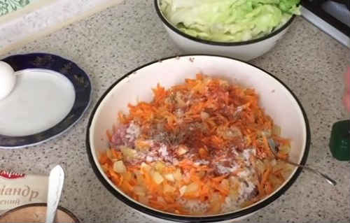 Додайте в миску рис, засмажені овочі. Засипте необхідні приправи, посоліть. Розбийте в миску яйце. Остаточно вимісіть фаршевую масу.