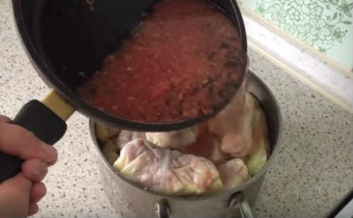 Заливку в страву можна зробити різну. Налийте на сковороду воду, додайте натертий помідор. Посоліть, здобріть заливку перцем. Коли вміст закипить, перелийте в каструлю. Багато господині розводять томатну пасту, додають сметану.