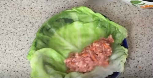 - Розправте лист капусти, викладіть на одну половину фарш, сформуйте голубець.