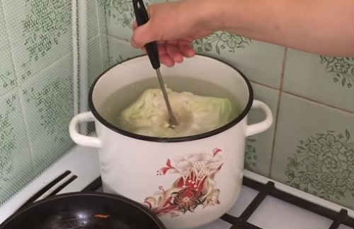 - Проваріть в каструлі з киплячою водою качан капусти (не забудьте видалити качан). Поступово відокремте листя, зріжте тверді прожилки біля основи листків.