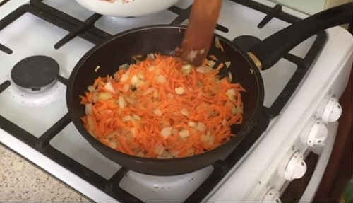 - Порізати одну цибулину, натерти моркву обсмажте в невеликій кількості олії до рум’яного кольору.