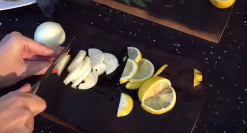 Потім поріжте кружечками лимон, цибулину поділіть півкільцями.
