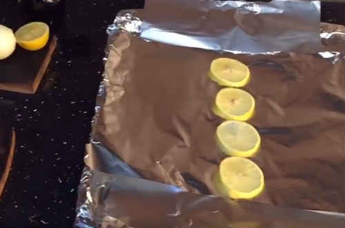 На деко постеліть лист фольги, викладіть подушечкою лимонні гуртки, як на фото, доріжкою. Фольгу кладіть з запасом, враховуючи, що частина піде на загортання тушки.