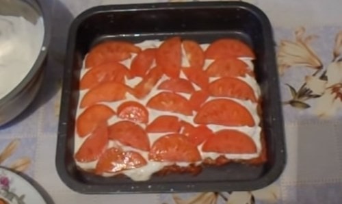 Довільно розподіліть по поверхні сметани гуртки помідорів.