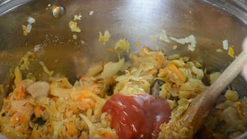 Налийте належну кількість томатного соусу, знову перемішайте масу.