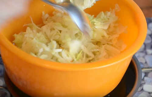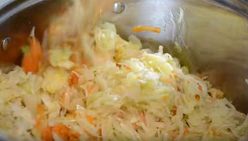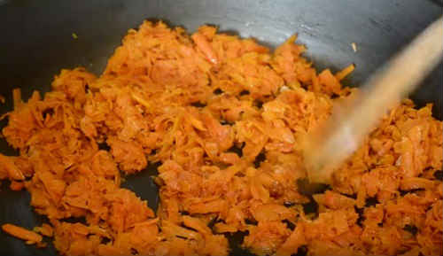 Потім влийте на сковорідку ще масло, обсмажте до рум’яного кольору морквину. Додайте до капусти.