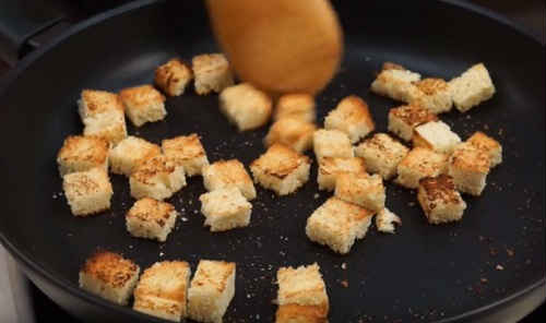 Суп буде смачніше, якщо запропонувати до нього грінки, обсмажені з кубиків батона в невеликій кількості олії.
