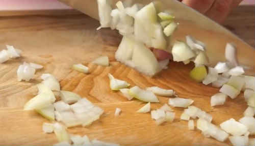 - Покришіть кубиками очищену головку цибулі.