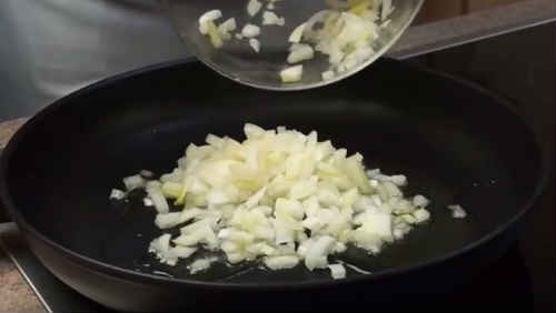 - Обсмажте покришену кубиками цибулину у вершковому маслі.
