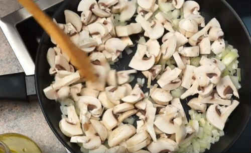 - Розпустіть на сковорідці вершкове масло, спочатку обсмажте цибулю до прозорості. Після закиньте гриби, продовжуйте готувати до випаровування рідини. Не забудьте підсолити і посипати вміст перцем.