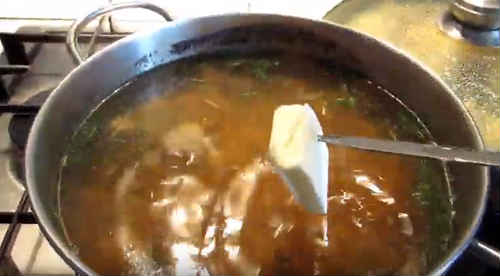 З’явиться піна – забирайте. Продовжуйте варіння ще 10 хвилин. потім додайте спеції зі списку. Покладіть шматочок масла, оскільки наш грибний суп без засмажки.