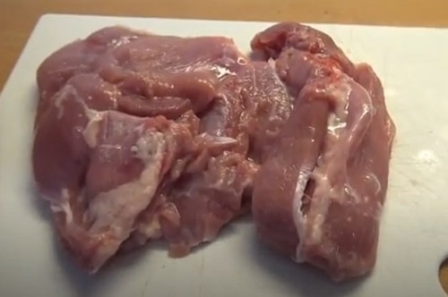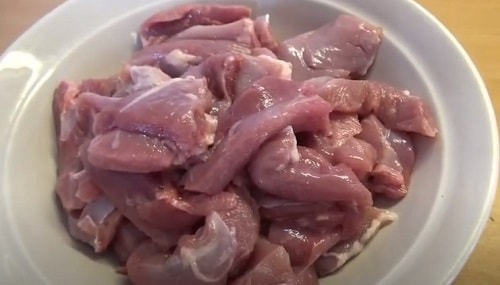 - Помийте м'ясо, поділіть невеликими брусочками.