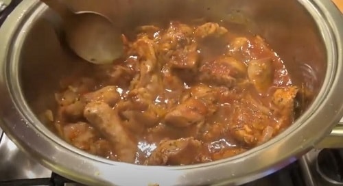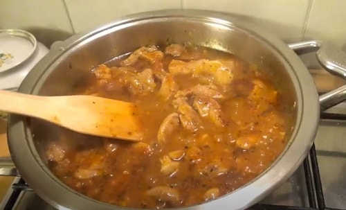Гасіть блюдо під кришкою до м'якості м'яса, зменшивши потужність вогню до мінімуму. Орієнтовний час приготування – 20-30 хвилин, в залежності від величини шматочків філе. Періодично помішуйте. Не забувайте, що частина рідини випарується, якщо вирішите, що підлива занадто густа, підлити трохи бульйону.