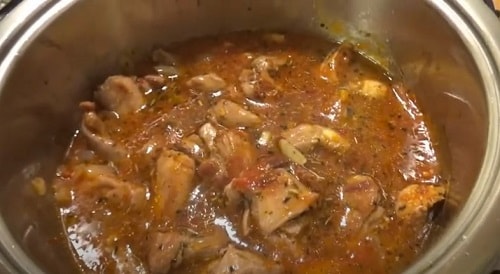 Перекладіть індичку в томатну підливу. Поперчіть, посоліть. На даному етапі ви можете заправити підливу будь-якими приправами на свій смак.