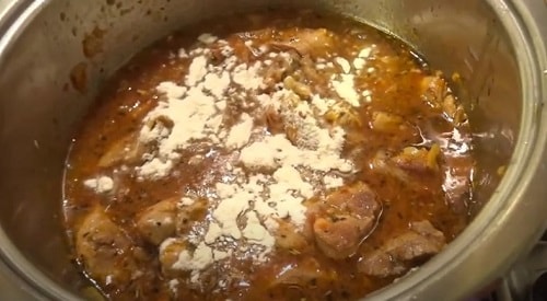 - Через кілька хвилин спільного приготування підсипте борошно. Викладіть томат, сметану. Влийте воду, розмішайте.