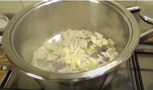 - Подрібніть цибулину дрібними кубиками. Обсмажте на сковороді до невеликої румяности.