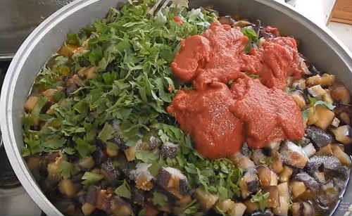 Покришіть петрушку, відправте в ікру томатну пасту. Перемішайте, продовжуйте повільно тушкувати на малому вогні. Відрахуйте 30 хвилин з моменту закипання, потім вимкніть газ. В процесі неодмінно спробуйте ікру на сіль, при необхідності відрегулюйте смак.