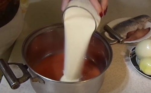 - Змішайте в каструлі томатний сік, олію, крупу манки. Доведіть до кипіння, варіть дві хвилинки, безперервно помішуючи вміст. Можна зробити трохи по-іншому. Залити спочатку масло з соком, закип’ятити, потім тонким струменем ввести манку. Обидва способи рівноцінні.