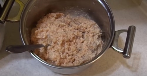 Додайте в каструлю з манкою перекручену оселедець, цибуля. Все сумлінно перемішати.