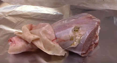 - Загорніть тушку у фольгу, відправте в духовку, розігріту до 200 про С. Готуйте 3 години.