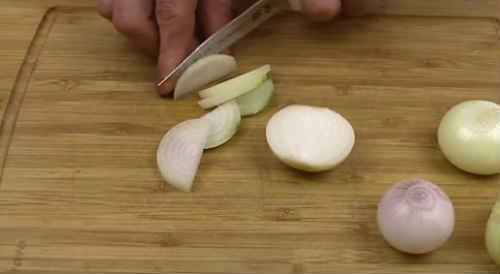 Наріжте півкільцями головку цибулі.