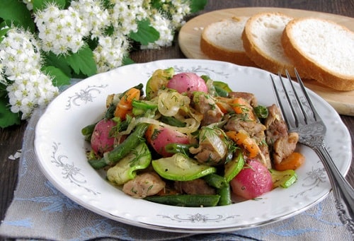 Дієтичний вечерю чи обід з соковитого м'яса з овочами оцінять всі, хто худне або просто любить смачно поїсти. Калорійність страви всього 52 ккал. на порцію в 100 гр.