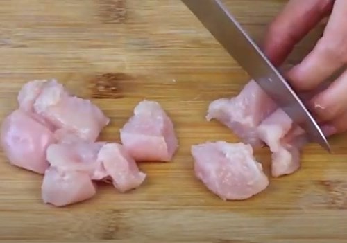 Обполосніть грудку. Поріжте філе птиці шматочками.
