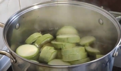 Закиньте в киплячий розсіл нарізку кабачків. Варити при бурхливому кипінні протягом 5 хвилин. Кружечки кабачків топите в маринаді ложкою, щоб вони бланшувалися повністю. Якщо заготовок багато, варіть в два етапи.