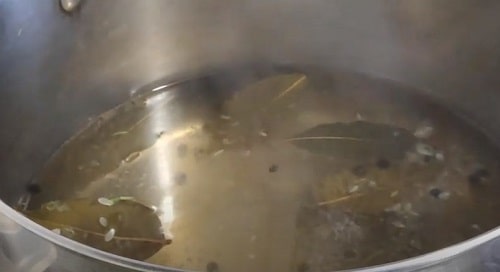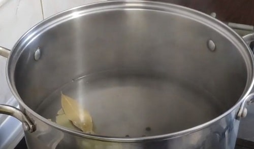 Закип’ятіть воду, додайте лавровий лист, засипте сіль з цукром. Киньте горошини перцю. Коли вода закипить, потримайте ще трохи, щоб кристали спецій повністю розпустилися.
