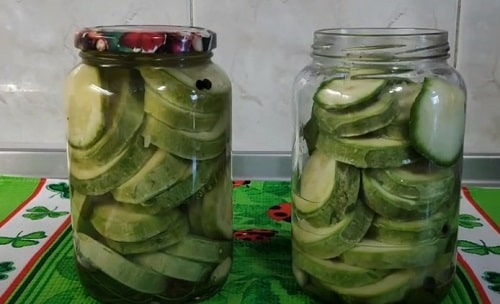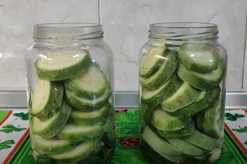 Наповніть ємності бланшированными кружечками кабачків. Постарайтеся укладати щільно, трохи утрамбовывайте по ходу.