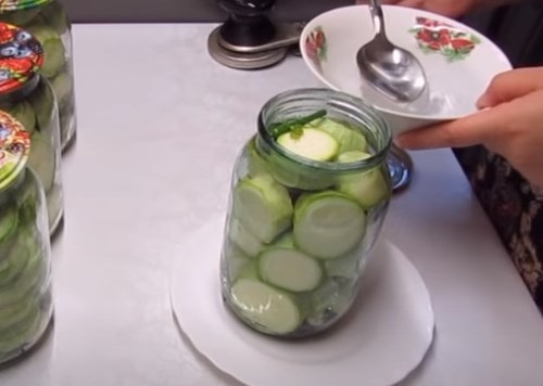 Набейте банки доверху кільцями кабачків. Укладайте щільно, трохи утрамбовуючи овочі.