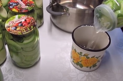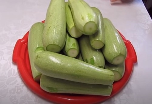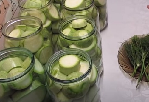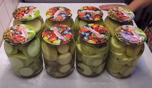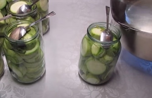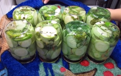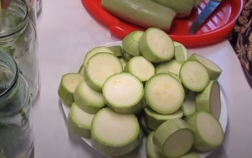 Оскільки консервування станемо робити методом подвійного заливки, банки годі й стерилізувати, але для кришок і гумою така процедура обов'язкова – неодмінно обробіть їх окропом. З даної кількості кабачків у вас вийде 8 літрових ємностей. Якщо хочете зробити салат з кабачків під смак грибів – ласкаво просимо на іншу сторінку.